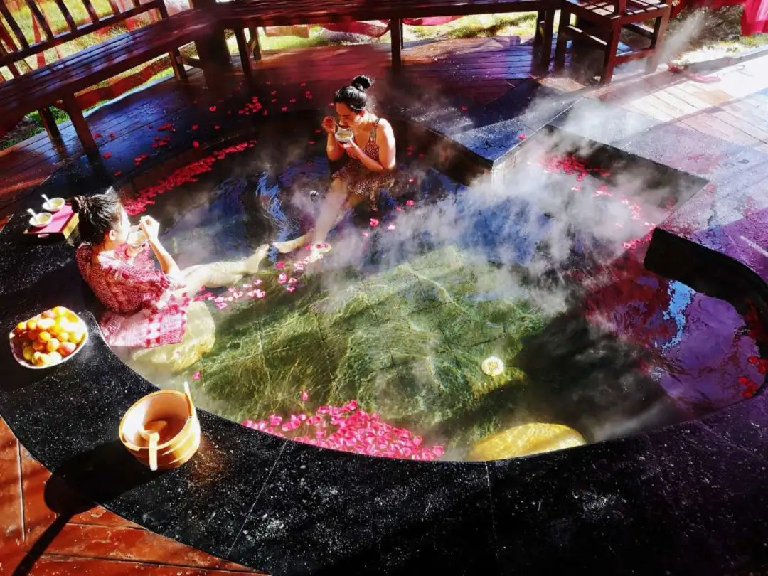 溫泉區(qū)域專為女士推出玫瑰香體湯、牛奶浴、紅酒浴,